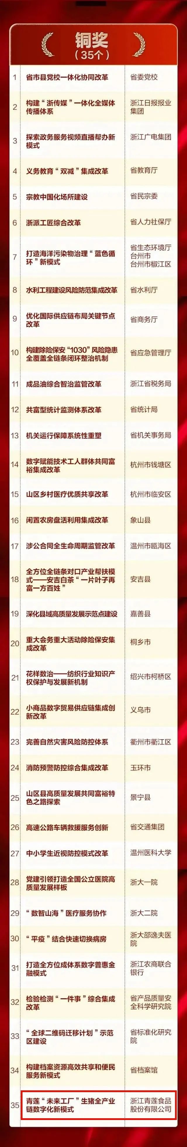 重磅!青蓮食品—膳博士榮獲浙江改革突破獎銅獎! 2023-02-02 08:37:26 浙江青蓮食品股份有限公司 瀏覽次數 7265 近日,浙江省委改革辦公布了2022年度浙江省改革突破獎名單。浙江青蓮食品股份有限公司“數智青蓮”未來工廠榮獲2022年度浙江省改革突破獎銅獎,是銅獎組中唯一的一家民營企業。20多年來,青蓮食品構建起從農場到餐桌的透明全產業鏈,在改革創新中以種業為源頭,建立起未來農場—未來工廠—產業新零售等數字化應用,真正從用戶需求出發為社會提供優質食品!此次獲得浙江改革突破獎銅獎,更是對青蓮食品數字化轉型成果的肯定和勉勵!實現黑豬專家膳博士在安全和美味雙升級上硬核突破!身為黑豬專家,膳博士服務過世博會、世乒賽、國際馬拉松比賽,連續8年為世界互聯網大會供肉,連續14年為中國極地研究中心供肉,成為杭州亞運會官方生鮮肉類產品供應商。以國家級嘉興黑豬和兩頭烏保種場作為種業基礎繁育國家級優質新品種,形成完整的黑豬商品體系為消費者帶來舌尖體驗。近年來,通過智慧養殖為傳統畜牧產業數字化轉型先行探路,以新一代信息技術為手段,重塑生豬全產業鏈生產組織方式和管理服務模式,構建“1+4+N”模型,推動全產業鏈數字化轉型。產業零售端以用戶需求為中心持續推出膳博士黑豬鮮肉鮮制系列產品提升消費體驗,滿足國人對美好生活、品質食品的向往。2022年,青蓮智慧牧場首批入選浙江省“未來農場”,“數智青蓮”未來工廠獲全省數字化改革“最佳應用”和全省數字經濟系統“最佳應用”。在全省數字化改革大會上做匯報演示,列入全省數字經濟系統地方特色應用目錄,受到央視、省級、市縣級等媒體持續關注報道。 上一條“風云浙商”許明曙:人生把一件事做好就很不容易 下一條全國唯一!膳博士·香雪白豬獲2022年度國家新品種認定!